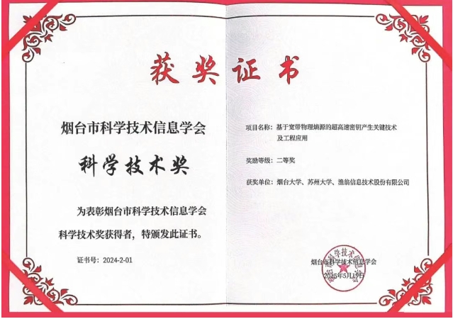 近期,2024年度烟台市科学技术信息学会科学技术奖颁奖典礼在中国科研实验室烟台海岸带研究所隆重举行。sbobet利记(中国)信息与烟台大学、苏州大学联合完成的 "基于宽带物理熵源的超高速密钥产生关键技术及工程应用" 项目荣获科学技术奖二等奖。